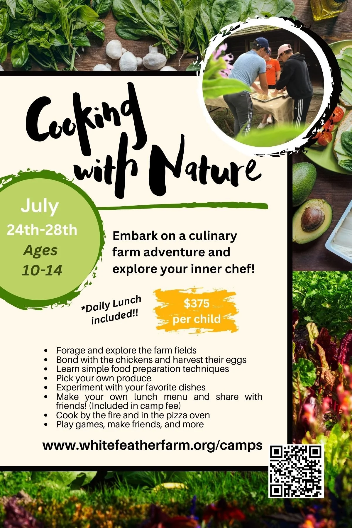 Embark on a culinary adventure on the grounds of the White Feather Farm. For a whole week, the farmed fields, wild woods and marshes will be yours to explore for the enjoyment of your taste buds. You will play with fresh off-the-ground flavors and textures to create your own dishes, make pizza or other favorites from scratch, and you will make friends with the farm’s chickens! Daily lunch is included!