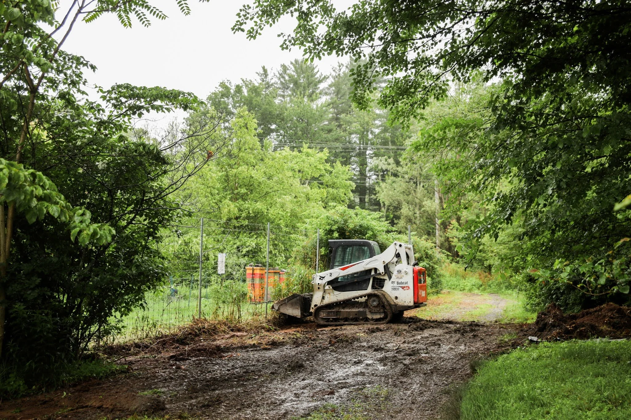 The mugwort-overrun path to Field D got the full treatment: a skid steer removed five to seven inches of topsoil, mugwort and all. So far, very little regrowth. We've laid wood chips as an additional barrier, and Kris Garnier is now selecting native shrubs for this area: hardy, perhaps brambly plants that provide habitat while serving as gentle deterrents to bears near our beehives.
